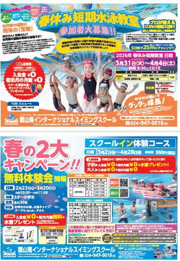 | 春の2大キャンペーンを実施!! @2月、3月はお子様限定無料体験会を開催!! A3月〜4月は、スクールイン体験コース!! この春、お得に水泳を始められるキャンペーンになっております!! ご家族、お友達をお誘いのうえ、ぜひお待ちしております(*^▽^*) どちらも予約が必要となります。 (電話またはお問い合わせフォームより) 下の画像をクリックすると拡大できます!! ![]() |